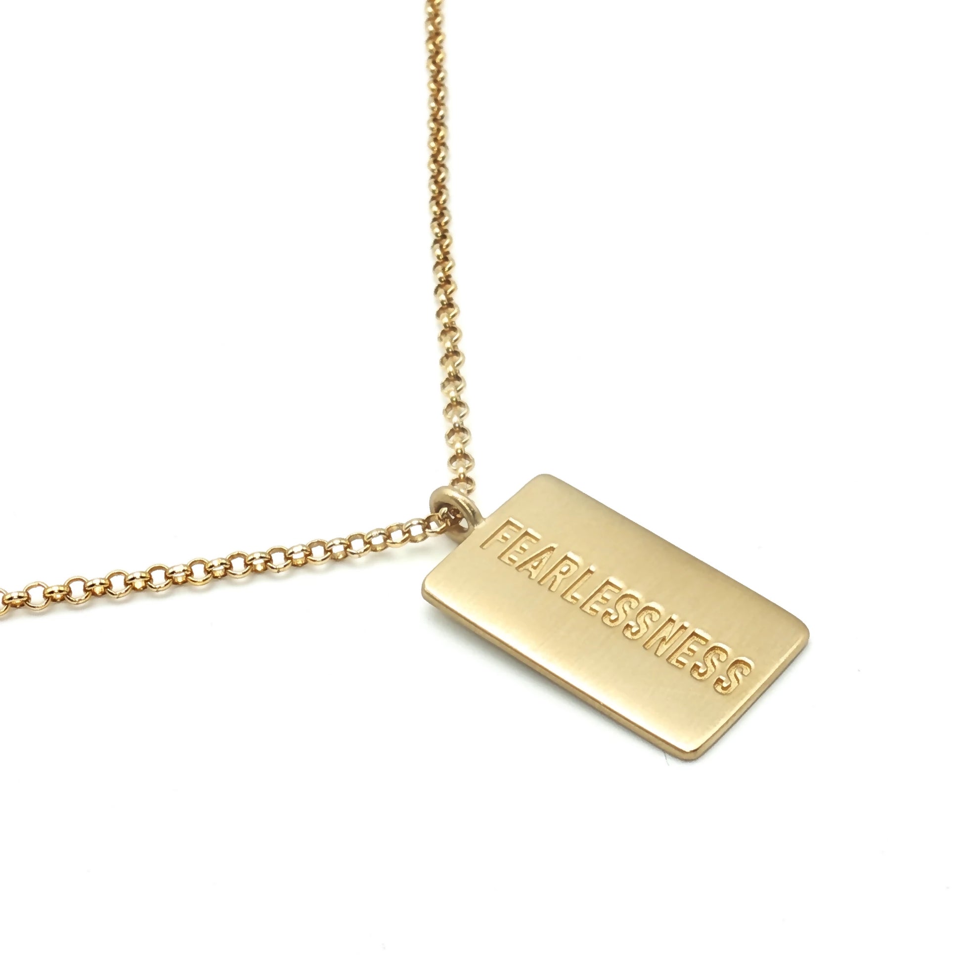 Radiate courage with this elegant charm necklace. Crafted in lustrous yellow gold, this piece features a rectangular pendant engraved with the empowering word 'FEARLESSNESS'. Suspended from a delicate chain, it's a perfect reminder to embrace strength and resilience. Elevate your style with this meaningful and sophisticated accessory.